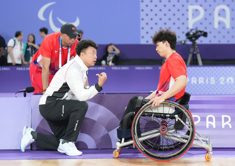 ↑9月2日,教练董炯(前左)在羽毛球男子单打WH1级决赛中指导球员屈子墨。新华社记者 贺灿铃 摄