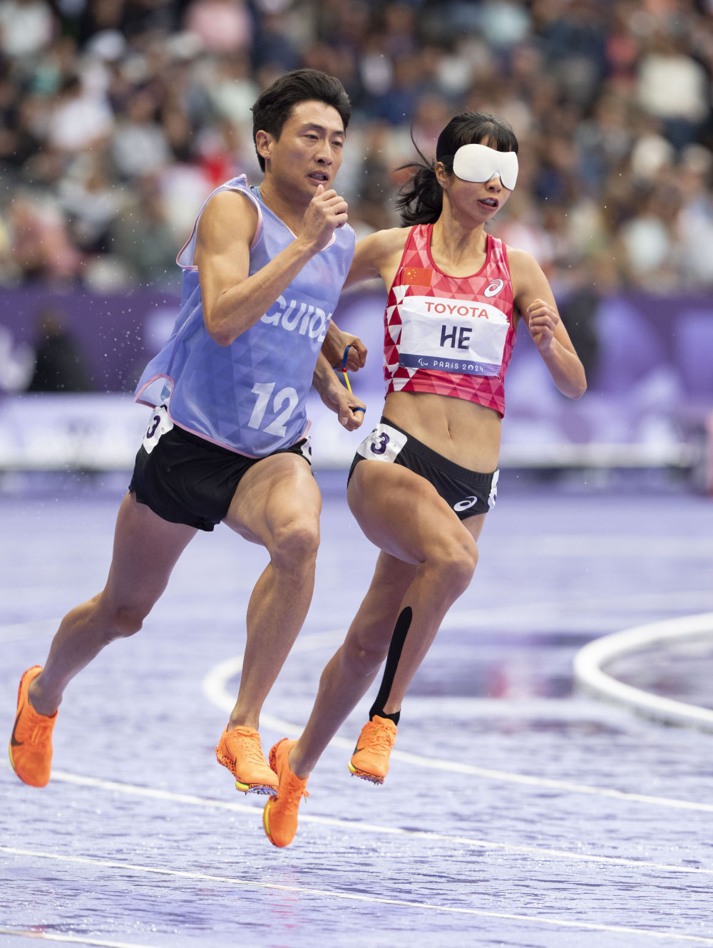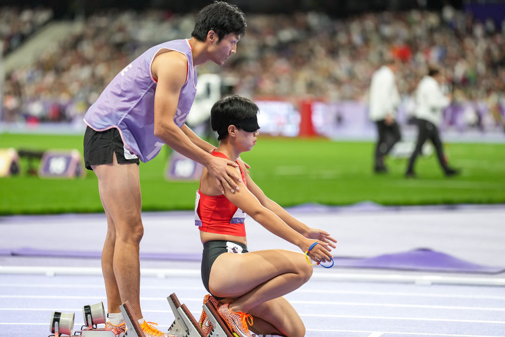 ↑8月30日,中国选手何珊珊(右)与领跑员游俊杰在田径女子400米T11级预赛中。新华社记者 才扬 摄