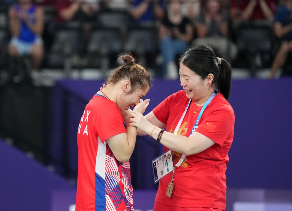 ↑9月2日,羽毛球女子单打SU5级决赛后,教练张先明(右)安慰获胜后喜极而泣的中国选手杨秋霞。新华社记者 贺灿铃 摄