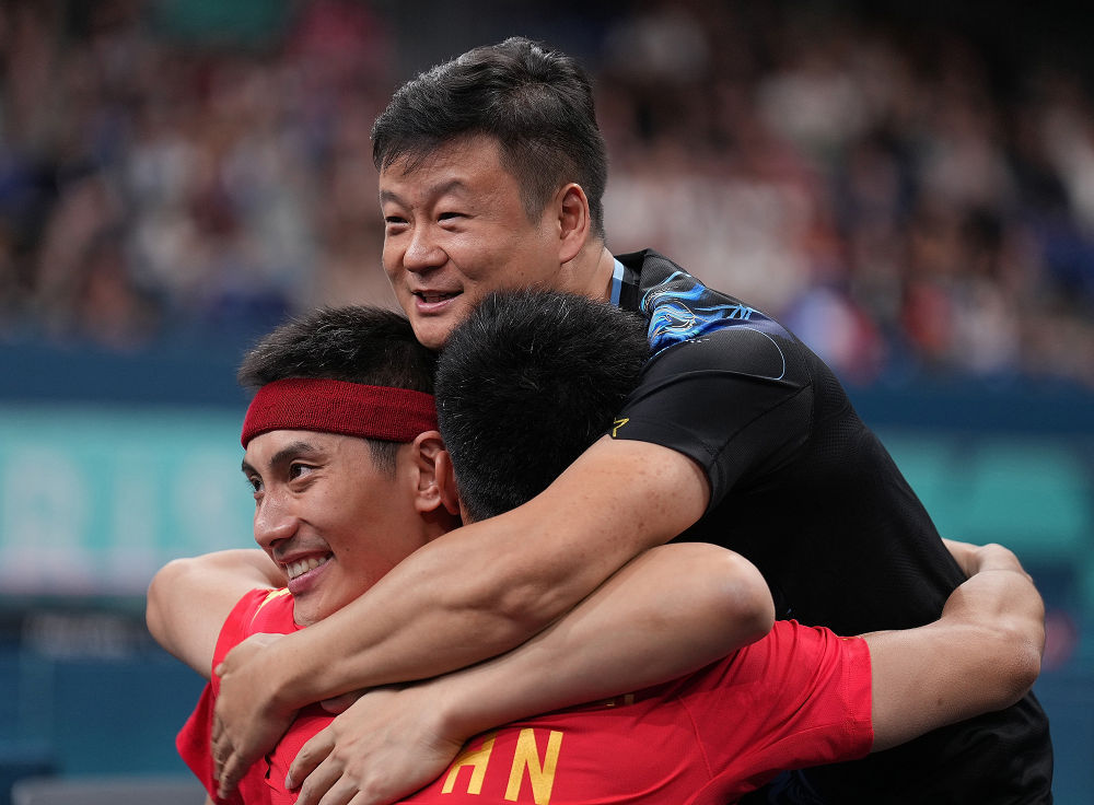 ↑8月31日,曹宁宁/冯攀峰(下左)夺得乒乓球男双8级冠军后与教练吕晓磊(上)拥抱庆祝夺冠。新华社记者 侯昭康 摄