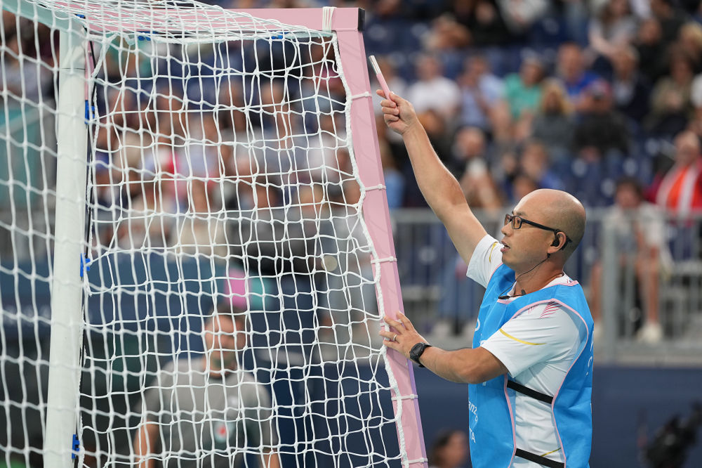 ↑9月3日,中国队引导员李进在盲人足球A组小组赛中用金属棒敲击门框帮助球员定位。新华社记者 熊琦 摄