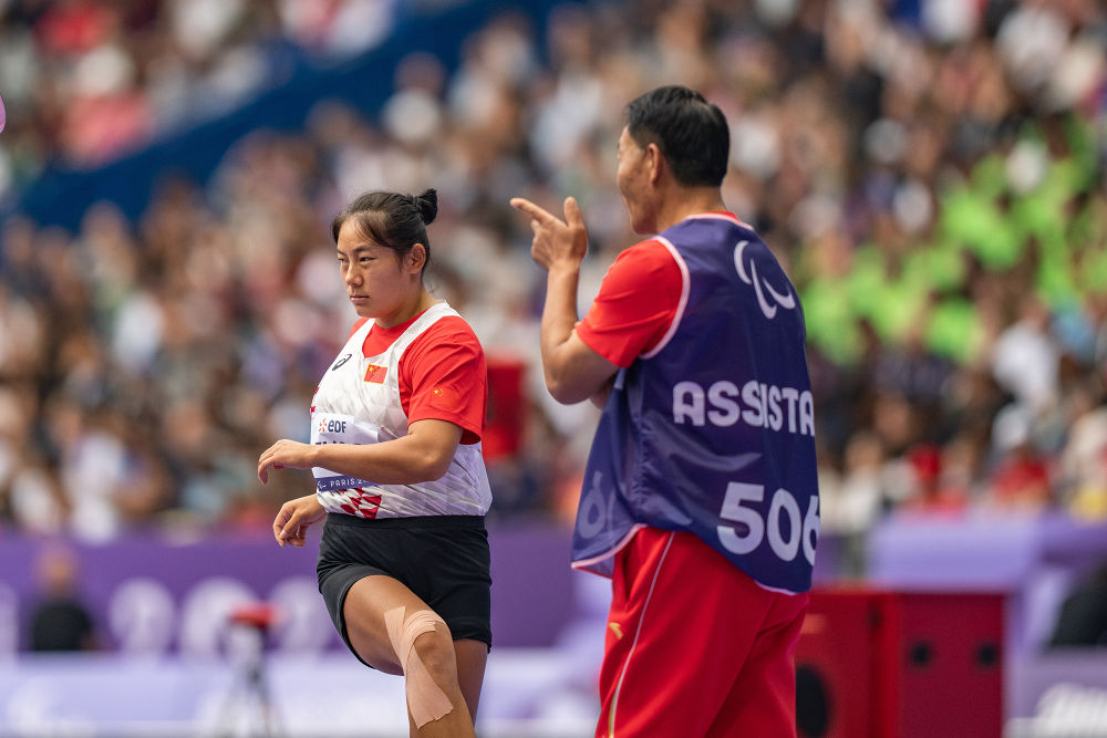 ↑8月31日,参加田径女子标枪F13级决赛的中国选手赵玉萍(左)在教练李秀清的指导下热身。最终,赵玉萍以47米06的成绩夺得冠军,并创造了新的女子标枪F12级世界纪录。新华社记者 黄伟 摄