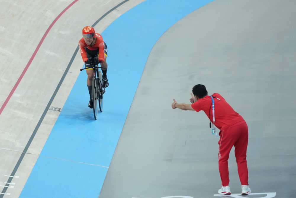 ↑8月29日,李樟煜(左)夺得场地自行车男子C1级3000米个人追逐赛冠军后,他的教练宋年春竖起大拇指祝贺。新华社记者 贺灿铃摄