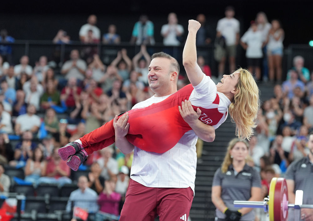 ↑9月4日,参加举重项目女子45公斤以上级比赛的土耳其选手纳兹米耶试举成功后,教练将她抱起庆祝。新华社记者 连漪 摄
