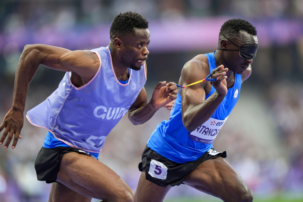 ↑8月31日,难民代表团选手阿坦加纳(右)和领跑员尼亚姆朱亚在田径男子400米T11级半决赛中。新华社记者 张铖 摄