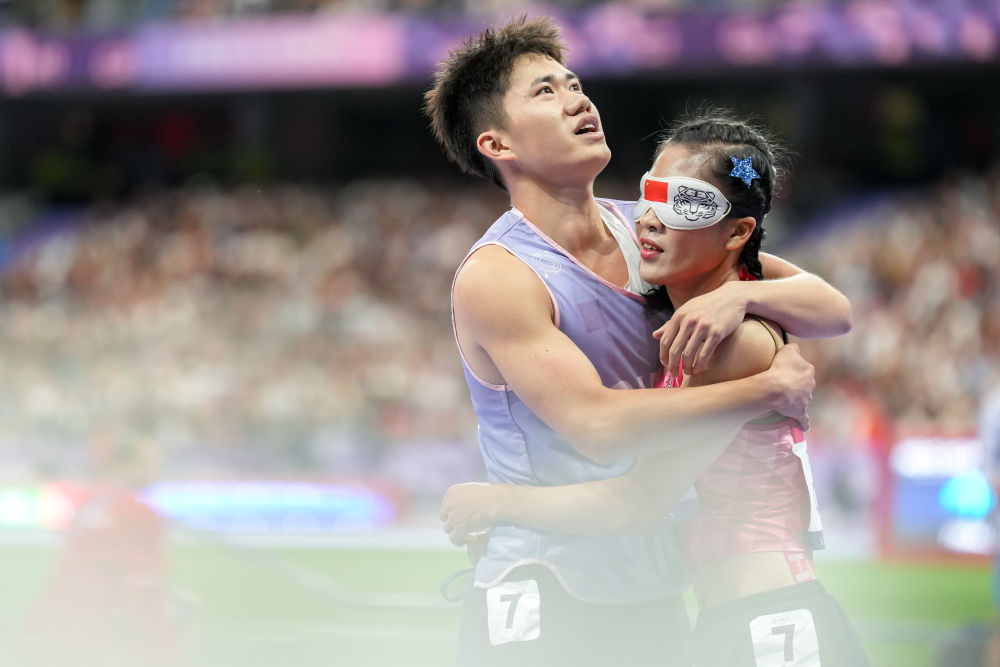 ↑9月2日,中国选手何珊珊(右)与领跑员游俊杰在田径女子1500米T11级决赛后。新华社记者 才扬 摄