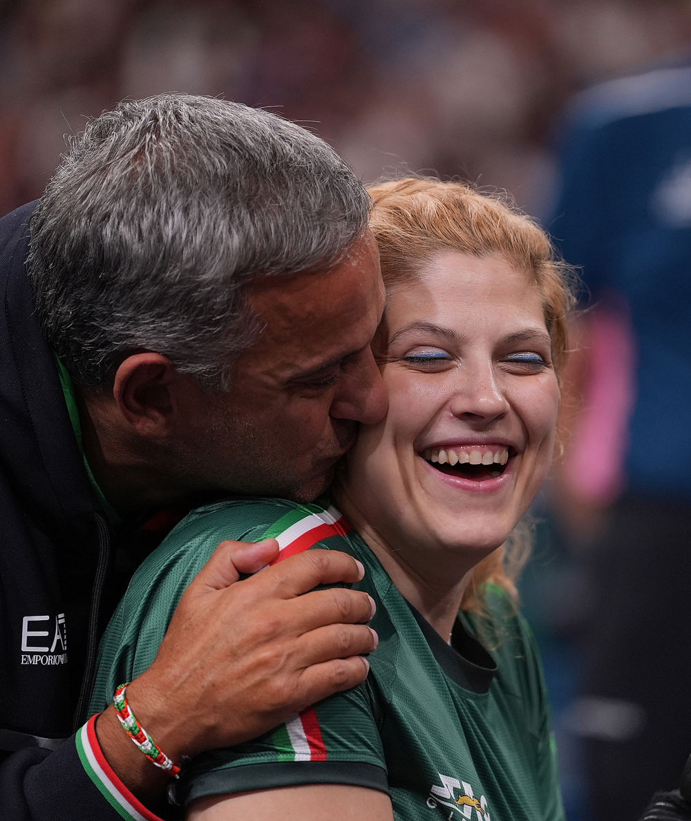 ↑9月6日,意大利队教练亲吻获得乒乓球女单1-2级冠军的意大利球员罗西(右)。 新华社记者 侯昭康 摄