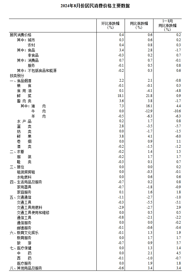 8月份,全国居民消费价格环比上涨0.4%。其中,城市上涨0.3%,农村上涨0.4%;食品价格上涨3.4%,非食品价格下降0.3%;消费品价格上涨0.7%,服务价格下降0.1%。
