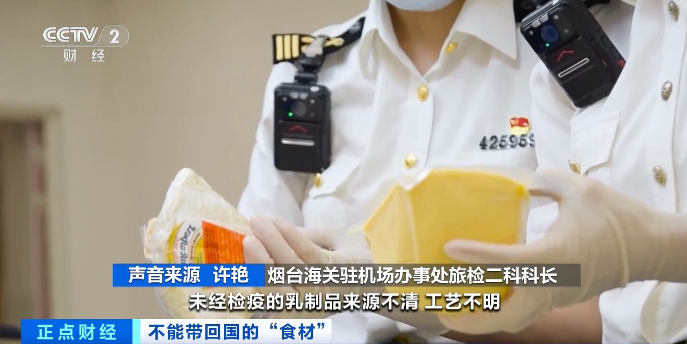 烟台海关驻机场办事处旅检二科科长 许艳:奶酪属于乳制品,未经检疫的乳制品来源不清、工艺不明,可能携带细菌、病毒等病原体,存在一定的食品安全和疫情疫病传播风险,影响身体健康和生物安全。