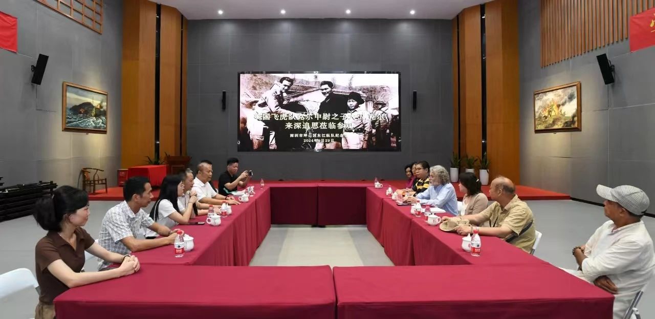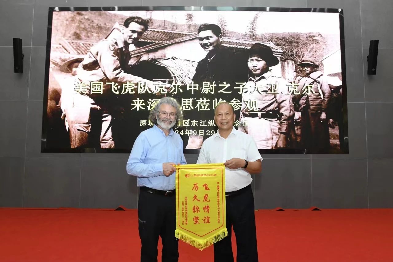 在东江纵队纪念馆参观期间,大卫·克尔参观了东江纵队司令员曾生将军故居,与纪念馆工作人员开展了座谈,畅谈来深圳开展追恩之旅的见闻感受,并向东纵纪念馆赠送了其父亲克尔中尉当年使用的“血幅”仿制件。同时,东江纵队纪念馆向其回赠了写有“飞虎精神,历久弥坚”的锦旗,寓意继承先辈遗愿,让中美友谊继续发扬光大。