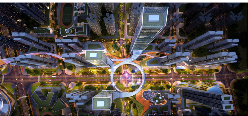 凭借独特的场地特点,本次规划确立“山水连城,公园城市”目标,在延续上位规划 “慢行环+通水生活轴”理念基础上,提出“一环、两轴、五节点”空间结构,打造一座集展览交流、商务商业、文化体验、娱乐休闲、旅游观光、交通换乘、智慧社区等多功能于一体的综合城区。