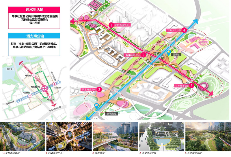 本规划旨在构筑“活力商业轴与通水生活轴”之双轴驱动,匠心融合区域的生态、文化与商业元素,打造一条集自然之美、人文之韵、商业之繁华于一体的迎宾大道。依托TOD站点之独特优势,将周边商业设施精妙融合,匠心规划五大主题商业街区,更以云环天街为纽带,串连五大街区与十大城市热点IP,打造深圳东部商业消费中心新地标,引领未来生活风尚。