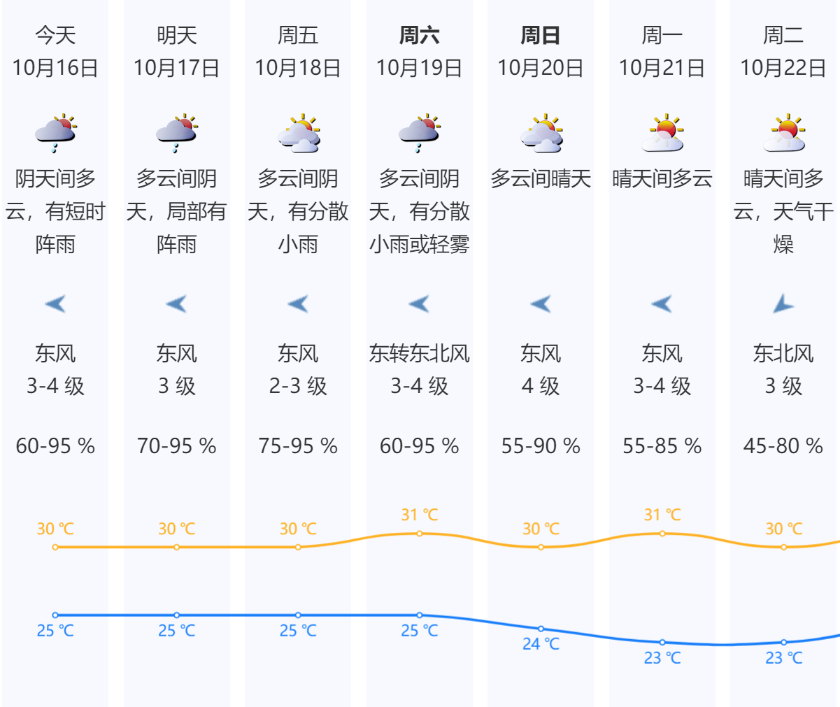 10月16日,深圳阴天间多云,有短时阵雨;气温25-30℃;东风3-4级,沿海、高地和海区阵风6-7级;相对湿度60%-95%。