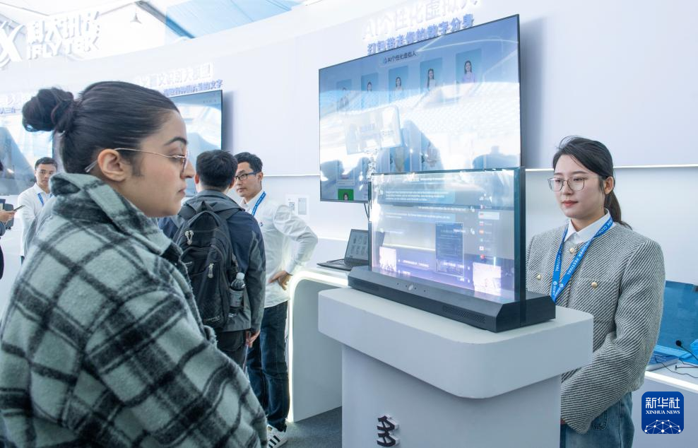 10月24日,观众在第七届世界声博会上体验一款多语种AI透明屏。新华社记者 傅天 摄