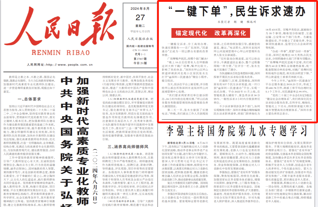 8月27日:人民日报头版报道坪山“民生诉求速办”,展现了坪山区在民生服务方面的卓越成效。