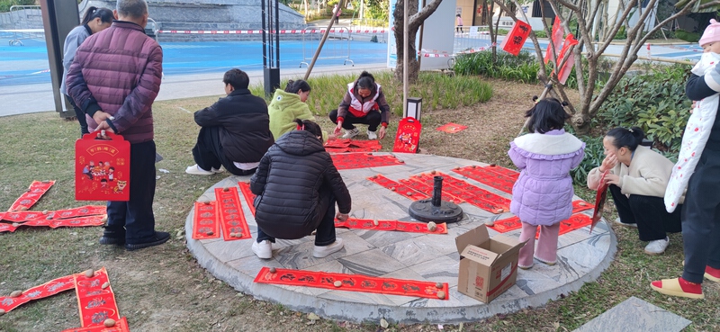 在位于江岭社区的东关珺府小区。一场热闹的春联书写活动正在进行,为即将到来的新春佳节增添了浓厚的节日氛国。