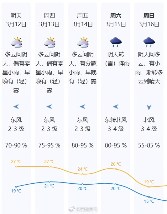 深圳新闻网2025年3月11日讯(深圳特区报记者 方胜)记者从深圳市气象台了解到,预计12日起偏南暖湿气流逐渐加强,深圳天气转温暖湿润,早晚有(轻)雾。具体来说:12日多云间阴天,气温19-27℃;13-15日白天多云间阴天,间中偶有零星小雨,天气回暖增湿,早晚有(轻)雾;15日夜间前后受新一股冷空气影响转(雷)阵雨;16日天气显著转凉。