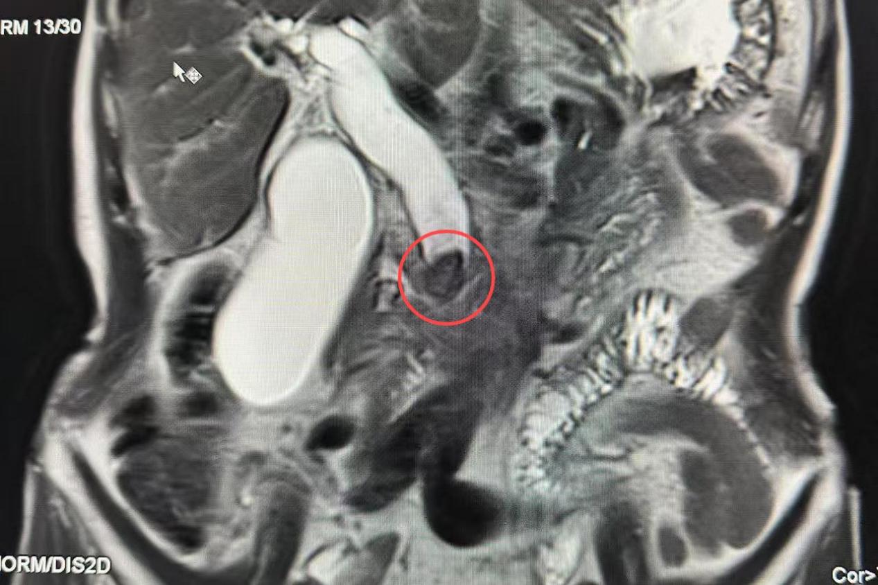 CT影像示肝外胆管扩张,胆总管下段结石嵌顿(红圈处)