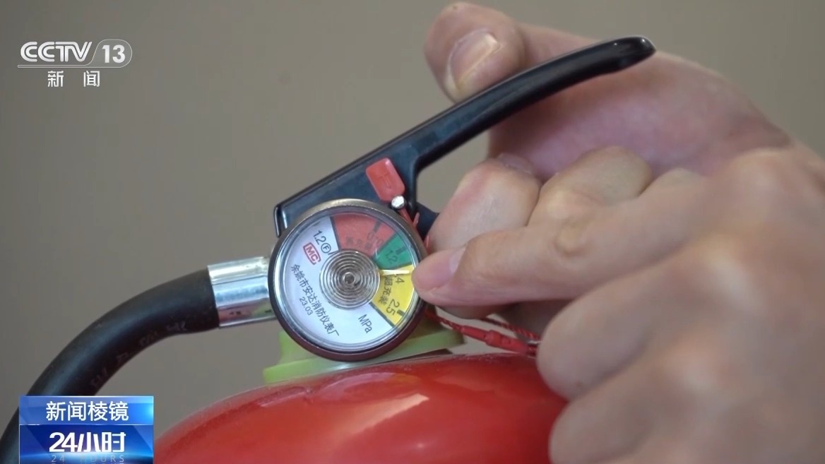 在内蒙古通辽的一家宾馆走廊内,消防人员看到,灭火器的压力指示器指针已经不在绿色区域范围内,说明罐体内压力不足,不可以正常使用,而喷射软管的长度也不达标。