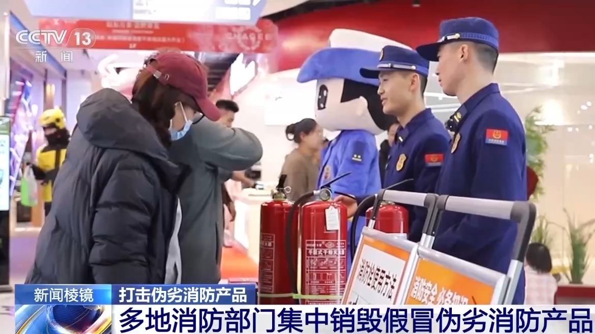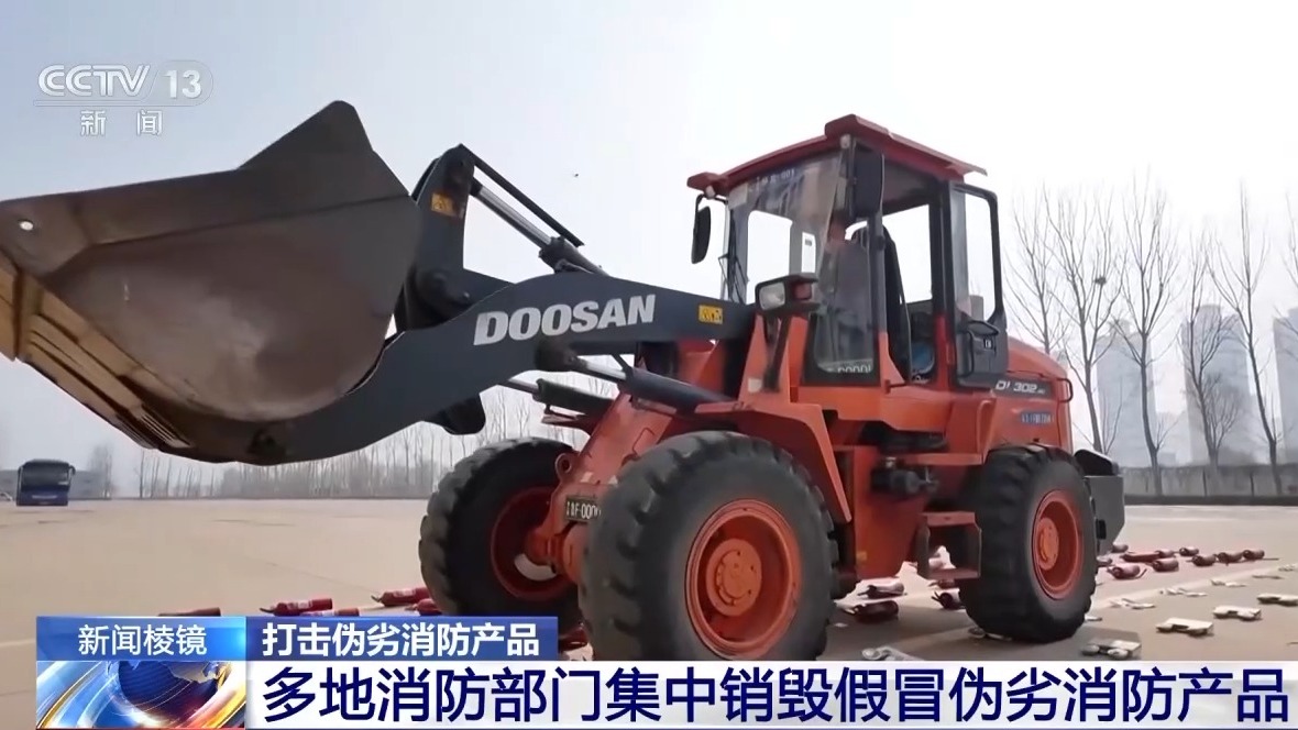 画面中,正在利用工程车、液压钳销毁的1600余件假冒伪劣消防产品是湖南株洲消防救援部门在近期执法检查中查获的。随着一声令下,工程车开进现场,对劣质过滤式自救呼吸器、烟感报警器等不合格消防产品进行碾轧报废,消防员使用液压钳对不合格的灭火器钢瓶进行破拆销毁,并将销毁的消防产品送入垃圾焚烧炉用于发电。