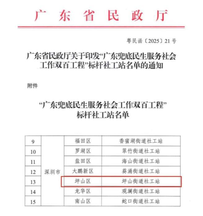 近日,在《广东省民政厅关于印发“广东兜底民生服务社会工作双百工程”标杆社工站名单的通知》中,坪山街道社工站入选全省首批“广东兜底民生服务社会工作双百工程”标杆社工站。