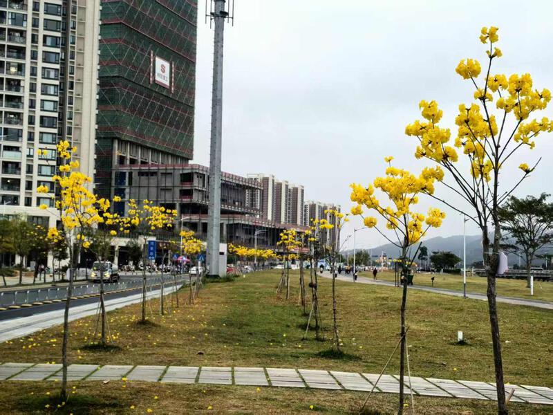 去年三月,龙田街道组织开展“共植党建共建林·同享花海一路美”主题植树活动,发动并倡议社会各界广泛参与“绿美龙田”生态建设,辖区企业积极响应号召,深圳村田科技有限公司和深圳市凯中精密技术股份有限公司向竹坑社区各捐种100棵黄花风铃木。这些树苗历经一年精心养护,今春已初绽芳华,未来将茁壮成长为高大挺拔的树木,为绿美龙田建设持续注入生态活力。