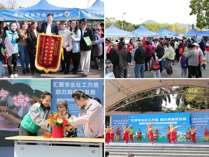 碧岭社区老年志愿者热情的腰鼓舞,传递了对生活的热爱。情景剧《心的桥梁之温暖相伴》,社工们以真实案例为原型,演绎助残帮扶的暖心故事……社工服务集市更是引燃全场,18个摊位“人气爆棚”。心理健康咨询、法律知识问答、公益义卖摊位前居民络绎不绝;互动游戏“社工知识大闯关”寓教于乐,让群众在趣味中了解社工工作;30余个优秀项目展板图文并茂,呈现坪山社工在助老扶幼、矛盾调解等领域的创新实践。活动现场,辖区社工服务机构向区委社会工作部赠送锦旗,表达对社会工作部长期以来支持行业发展所做工作的由衷感谢。居民王女士感慨:“原来社工默默做了这么多,他们是社区真正的‘贴心人’!”