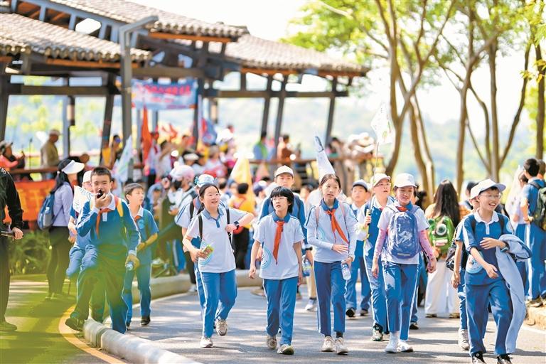深圳新闻网2025年3月24日讯(深圳特区报记者 郑铭 文/图)“20公里铺成绿色琴键,我们踩着第一缕晨光……”近日,来自罗湖区教科院实验教育集团的水库小学、布心小学、碧波小学、泰宁小学和淘金山小学5所学校共1698名六年级学生高举自己亲手绘制的旗帜,在歌声中踏上20公里的远足征程。