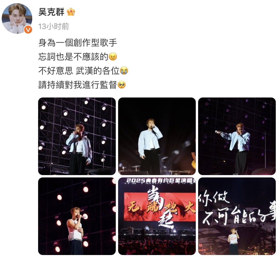 吴克群在个人微博发文:“身为一个创作型歌手,忘词也是不应该的,不好意思武汉的各位,请持续对我进行监督。”