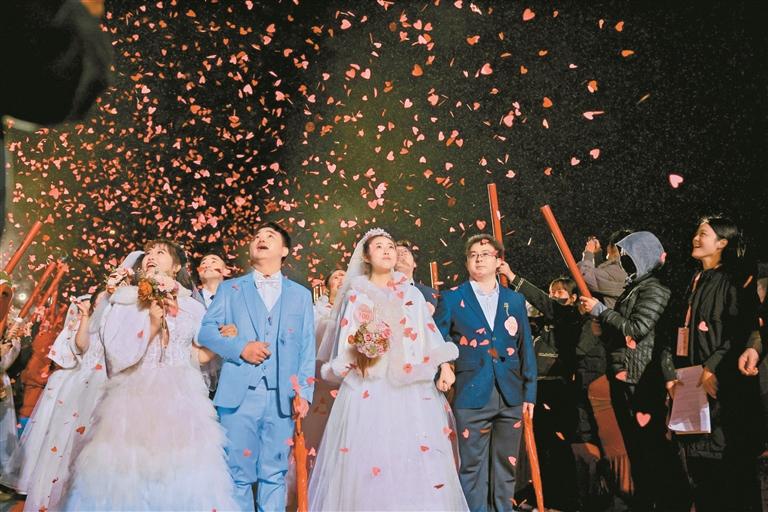 “娘家人致辞”“家属代表送祝福”“新人代表分享爱情故事”“派发新人大礼包”“甜蜜互动”“精彩表演”……一个个温情环节轮番进行,一份份爱与祝福向新人们悉数送出。