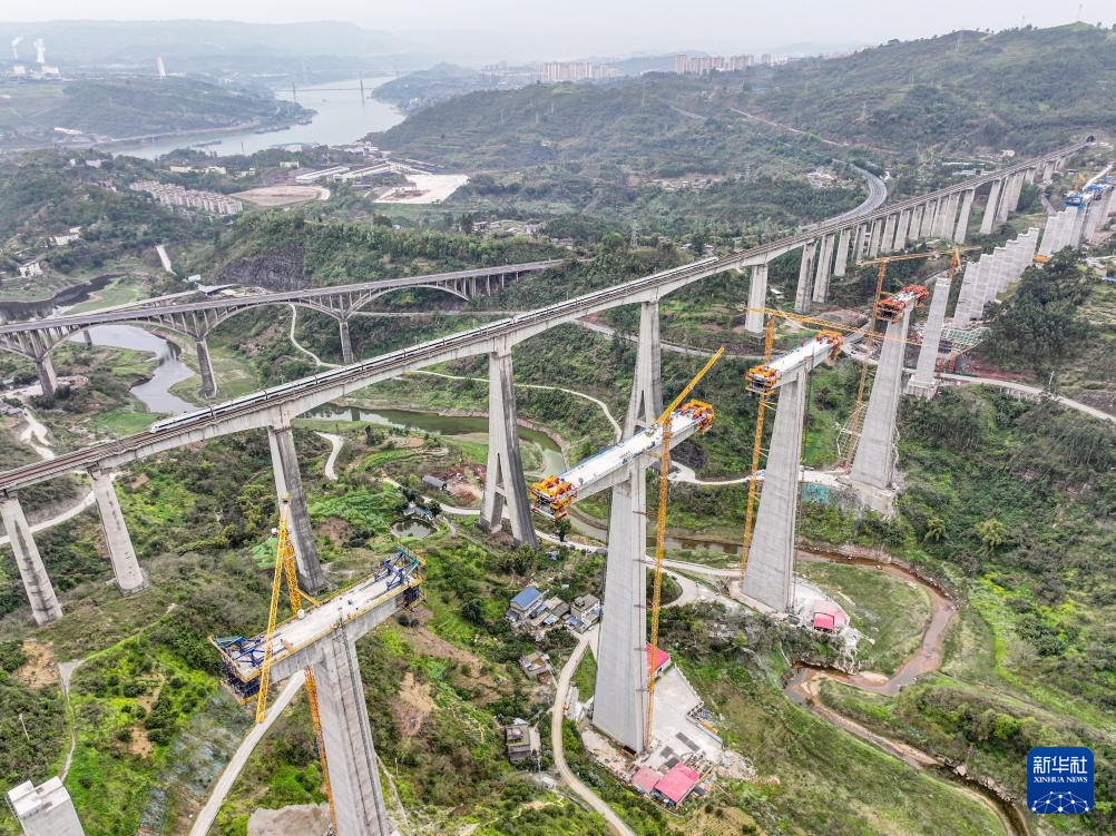 这是3月28日拍摄的渝万高铁蔡家沟双线特大桥建设现场(无人机照片)。
