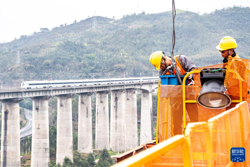 3月28日,在渝万高铁蔡家沟双线特大桥建设现场,工人在抓紧施工。新华社记者 唐奕 摄