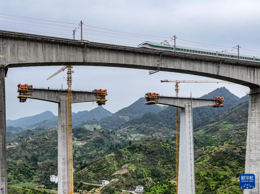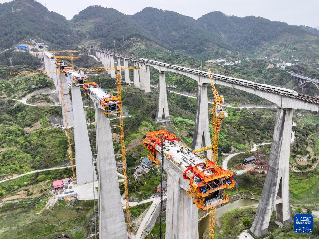 这是3月28日拍摄的渝万高铁蔡家沟双线特大桥建设现场。新华社记者 唐奕 摄