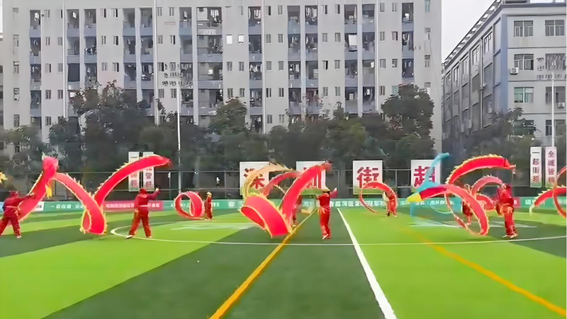 15:45时,伴随《中国龙》的激昂旋律,11条8米长的彩带龙从队员手中腾空而起,彩龙随腕力翻卷,时而如虹贯日直冲云霄,时而似游鱼戏浪环场逡巡。队长手持龙头,以太极云手带动龙身划出金色弧光,队员则以跃步转身甩出“飞龙逐日”,绸带破风声恰似呼应足球赛场的攻防节奏。“传统彩带龙多单打独斗,我们创新编排出群龙共舞的阵型,让11条彩龙既独立成章又浑然一体。”队长透露。