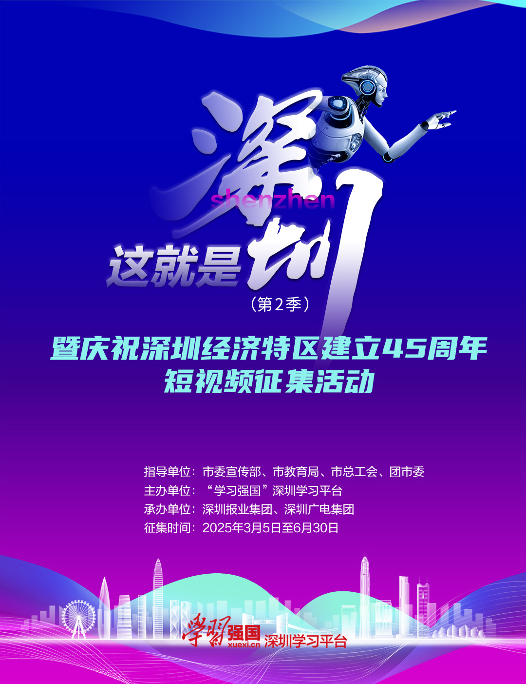 为庆祝深圳经济特区建立45周年,展现中国式现代化先行示范的辉煌历程与成就,赓续弘扬敢闯敢试、敢为人先、埋头苦干的特区精神,“学习强国”深圳学习平台现启动“这就是深圳”(第2季)短视频征集活动,运用短视频充分展现深圳在经济社会等各方面的生动实践和丰硕成果,精彩讲述深圳故事、大湾区故事、中国故事。