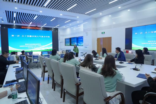 为了能切身感受深圳生态环境监测数字化、智能化、信息化发展成果,各位学员一起走进深圳监测中心站。在监测大楼一楼,学员通过“深圳环境监测的一天”电子大屏系统了解全市生态环境监测工作;在预报预警中心,学员通过市区高精度大气监测网络实时数据,深入理解空气质量监测和会商流程,同时让大家更直观地了解一线生态环境监测工作。在环境监测分析实验室,学员近距离观察大气、水、土壤样本分析流程,了解了无人送样和自动化分析技术,对现代化的生态环境监测的认识更近了一步。
