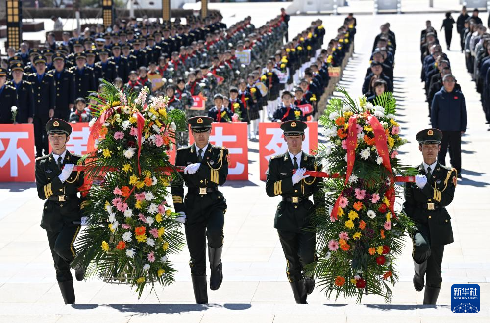 4月2日,仪仗队员在内蒙古呼和浩特市大青山红色文化公园向人民英雄纪念碑敬献花篮。