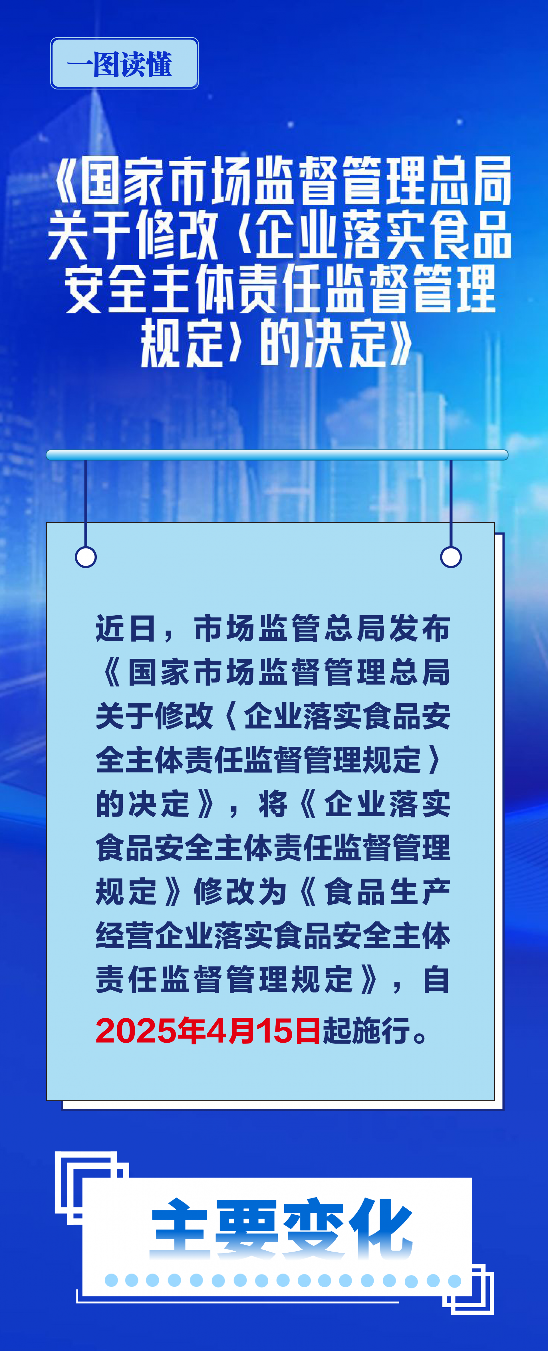 记者今天了解到,市场监管总局近日将《企业落实食品安全主体责任监督管理规定》修改为《食品生产经营企业落实食品安全主体责任监督管理规定》,自2025年4月15日起施行。
