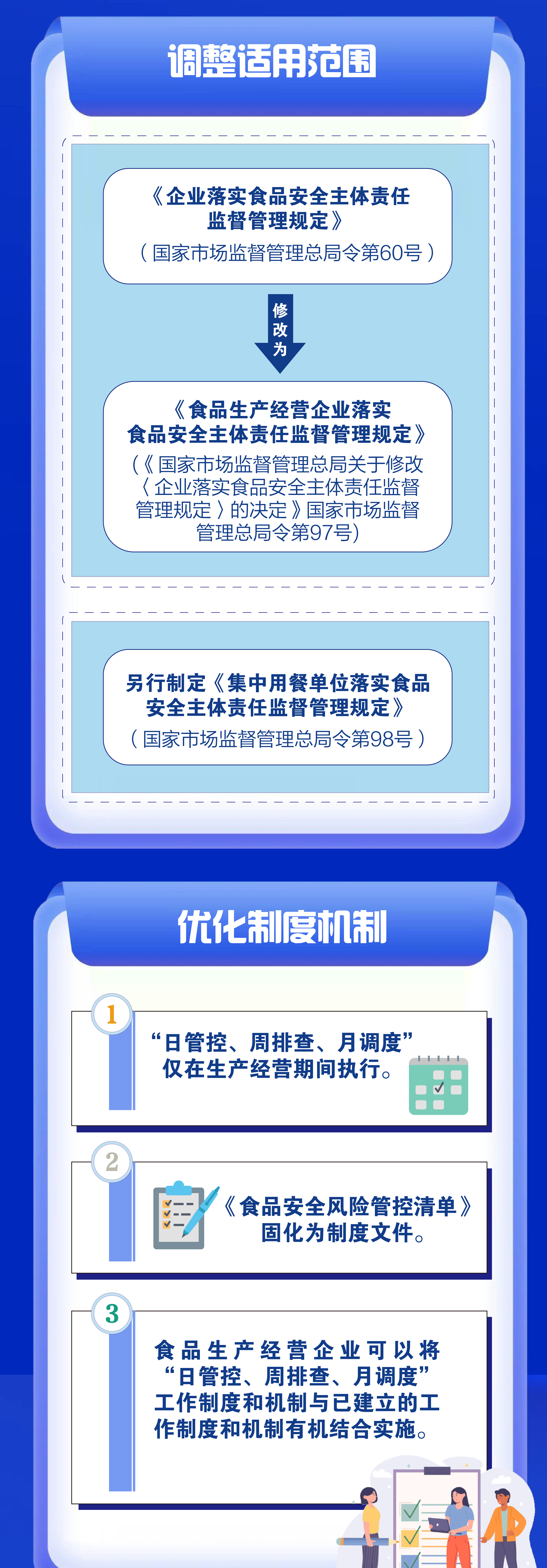 二是优化工作制度机制,避免增加企业不必要的负担。《规定》明确“日管控、周排查、月调度”制度在生产经营期间执行,同时将《食品安全风险管控清单》固化为制度文件。规定食品生产经营企业可以将“日管控、周排查、月调度”工作制度和机制与已建立的工作制度和机制有机结合实施,避免实际执行中机械重复相同工作。