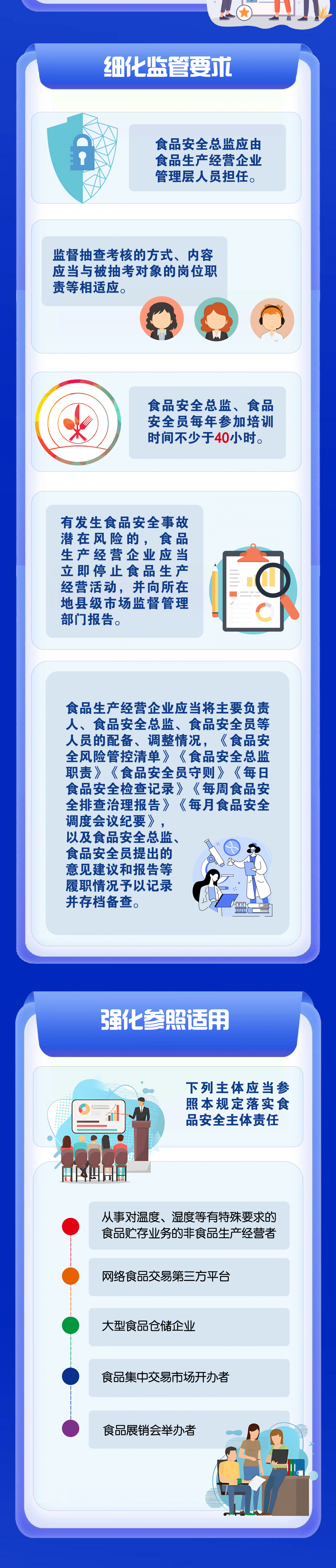 三是细化监管具体要求,回应基层监管实践面临的问题。《规定》补充完善主要负责人、食品安全总监、食品安全员的定义,明确食品安全总监应当由食品生产经营企业管理层人员担任。规定监督抽查考核的方式、内容应当与被抽考对象的岗位职责等相适应,且食品安全总监、食品安全员每年参加培训时间不少于40小时。