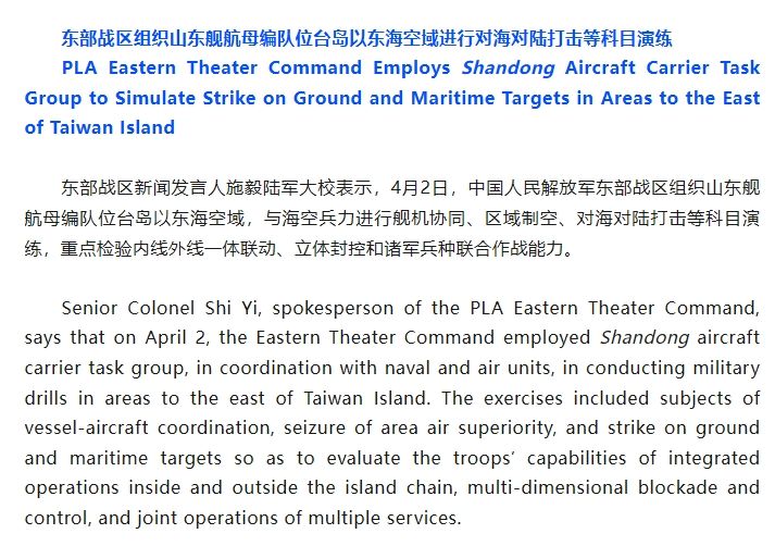 东部战区新闻发言人施毅陆军大校表示,4月2日,中国人民解放军东部战区组织山东舰航母编队位台岛以东海空域,与海空兵力进行舰机协同、区域制空、对海对陆打击等科目演练,重点检验内线外线一体联动、立体封控和诸军兵种联合作战能力。