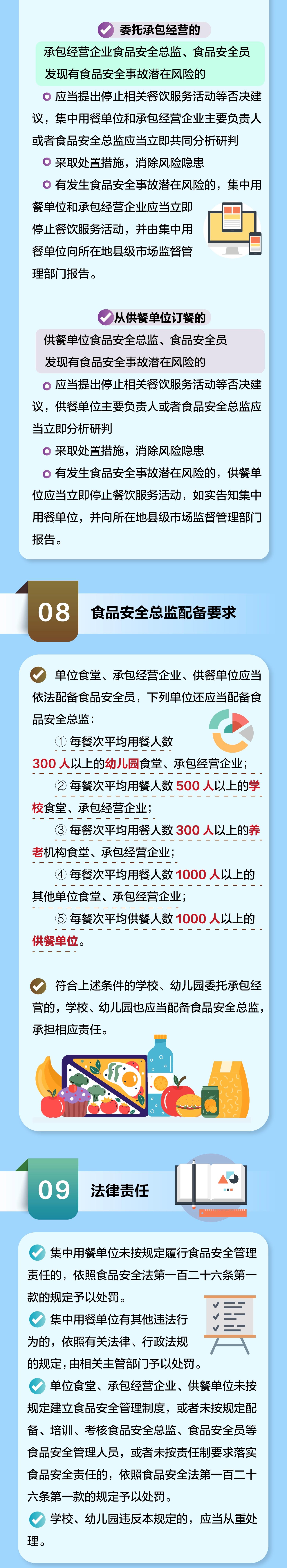 《规定》共27条,对集中用餐单位、单位食堂、承包经营企业、供餐单位,从责任分配、风险防控机制、食品安全管理人员配备和任职要求、法律责任等方面进行了规定。主要内容如下: