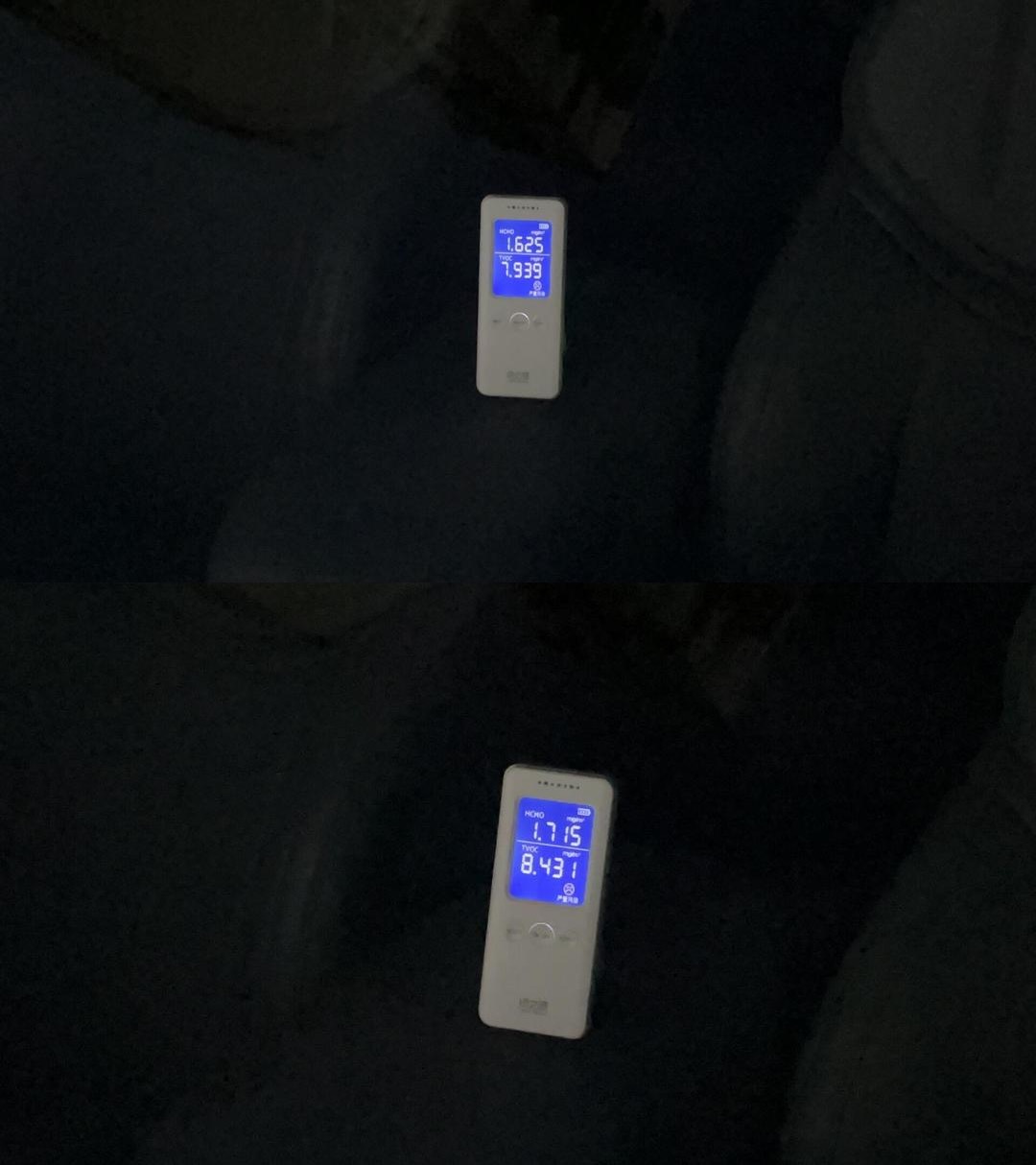 根据《室内空气质量标准》(GB/T 18883-2002)规定,室内HCHO(甲醛)浓度应≤0.10mg/m³,TVOC(总挥发性有机物)浓度应≤0.60mg/m³。记者在A先生提供的图片中看到,HCHO显示1.715mg/m³时,TVOC显示为8.431mg/m³。如果按照上述标准,两个数值均超标。