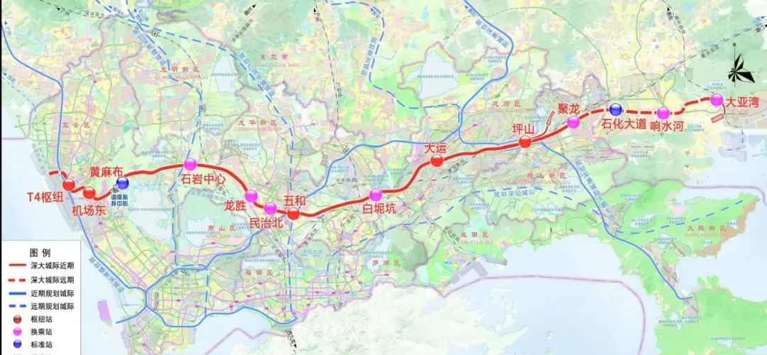 深大城际铁路深圳段线路起自深圳宝安国际机场T4枢纽,途经深圳市宝安、龙华、龙岗和坪山四区,止于坪山区聚龙站,全长69.2公里,设站11座,线路设计时速为160km。