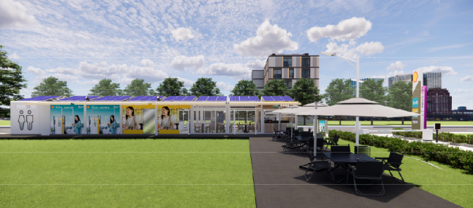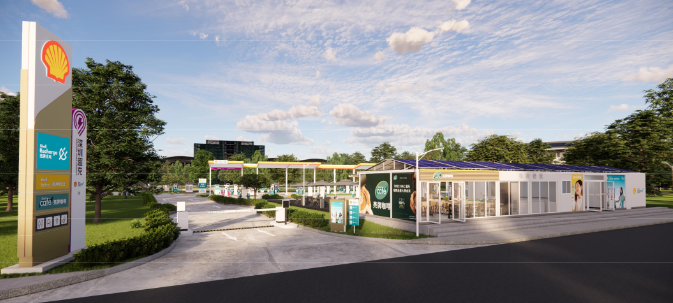 流线型光伏车棚、壳牌咖啡屋与公园景观无缝融合。