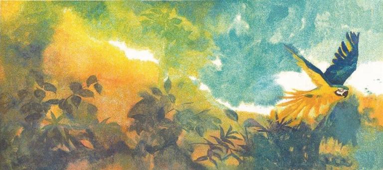 深圳画院美术馆展出的李康套色木刻作品《天光云影共徘徊》。