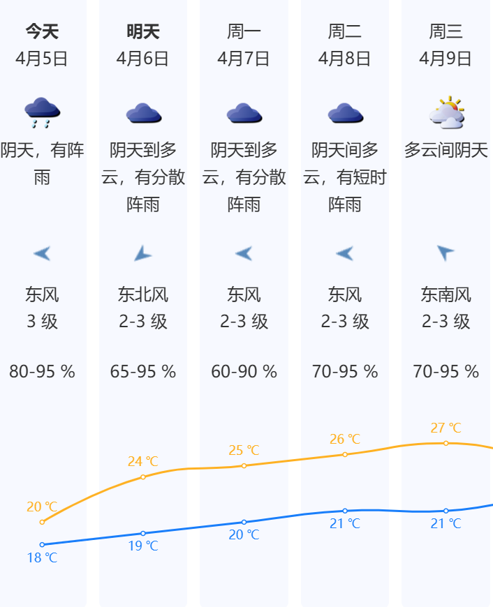 5日阴天,有间歇性阵雨,气温18-21℃,昼夜温差小;