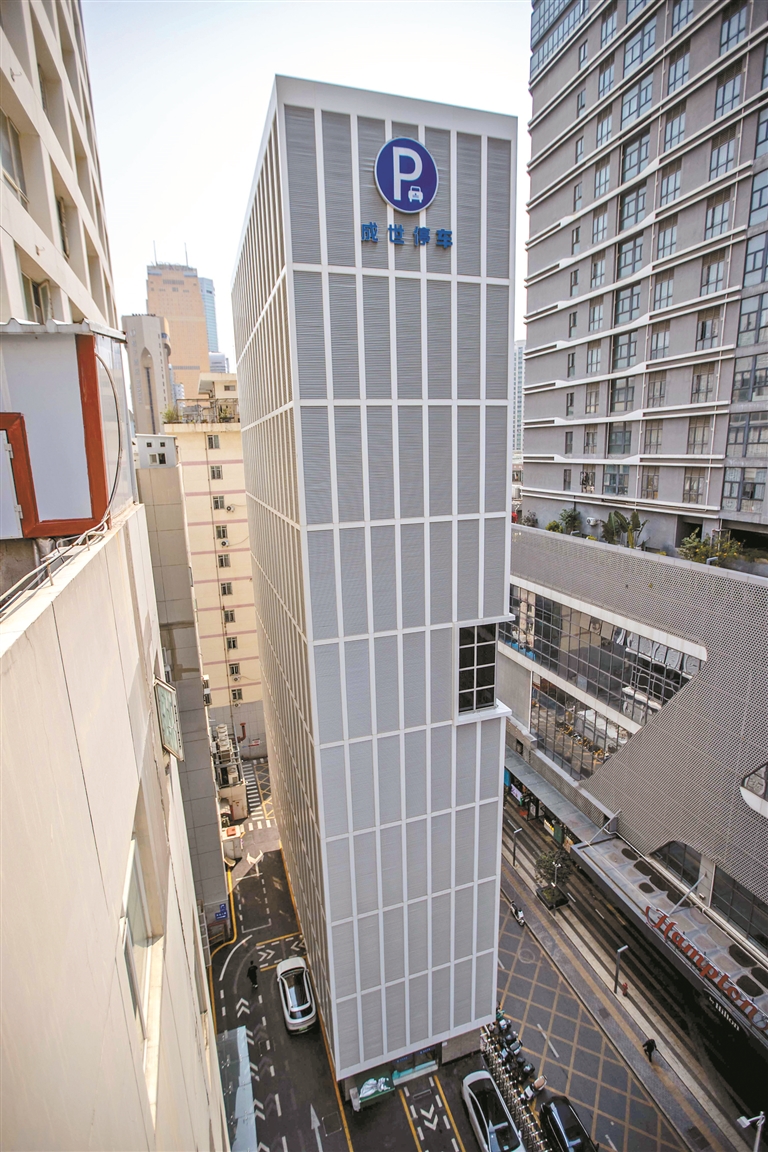 建设和运营方成世停车运营管理(深圳)有限公司相关负责人介绍,面对传统立体停车的痛点,该项目引入了诸多创新设计。比如,将车位尺寸拓宽至2米宽、2.05米高,可容纳市面上95%的车型,大型SUV亦可轻松停放;镂空金属外立面融合空气动力学原理,兼具自然通风与降噪功能;自主研发的智能调度系统使用精密算法与高性能传感器,配合升降系统配备大功率高效电机,大大优化了机械结构与运行逻辑,使平均停车或取车时间缩短至58秒,较同类设施提速40%。同时,车库外围预留完整消防通道与登高扑救面,内部配备防火隔断、人体激光雷达等功能设备,美观性、安全性、可靠性兼备。