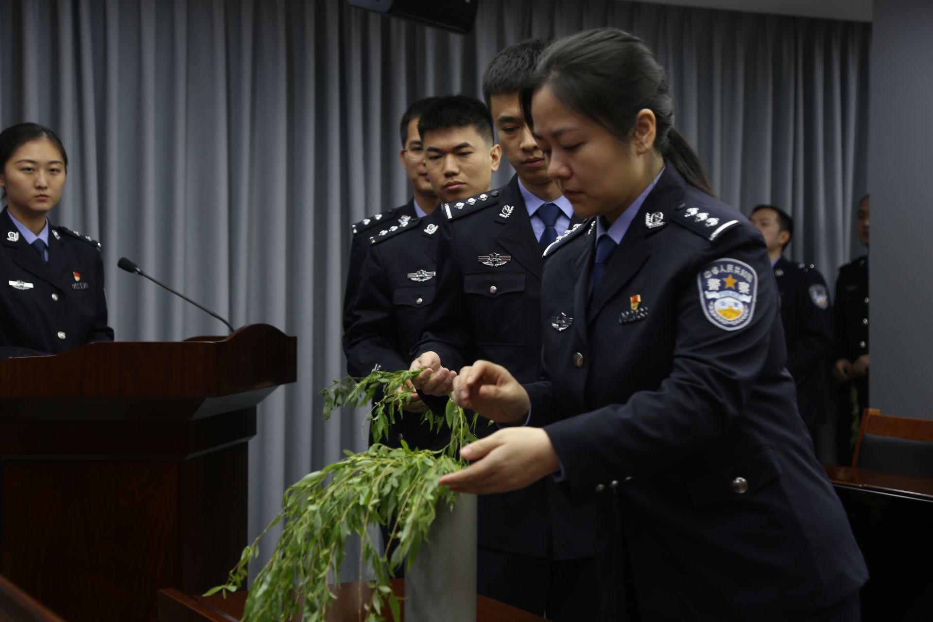伴随着庄严肃穆的音乐,青年民警们依次上台,将手中的柳枝投入瓶中,为英烈前辈献上内心最崇高的敬意。“如今,他们虽已离去,但他们的精神如星辰般闪耀。那不朽的警魂,激励着一代又一代的公安人,沿着他们的足迹奋勇前进......”全体人员起立,饱含深情地齐声朗诵。最后,活动在铿锵有力的宣誓声中结束,彰显了青年民警们继承英烈遗志、忠诚履职尽责的坚定决心。
