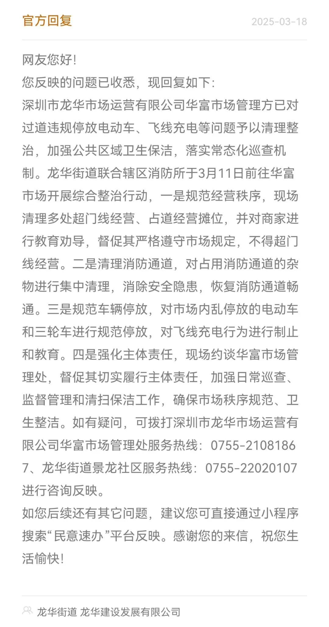如有疑问,可拨打深圳市龙华市场运营有限公司华富市场管理处服务热线:0755-21081867、龙华街道景龙社区服务热线:0755-22020107进行咨询反映。